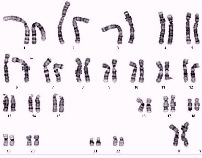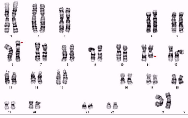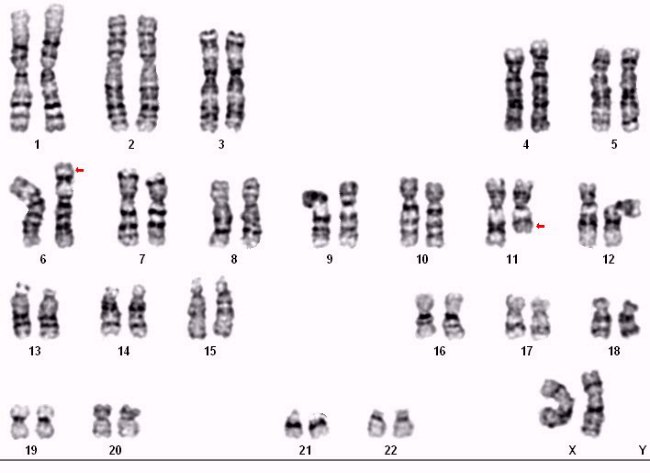 46,XX,t(6;11)(6qter>6p23::11q21>11qter;11pter>11q21::6p23>6pter)