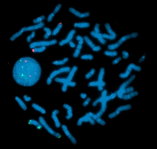 FISH FITC detects 6pter,Texas Red detects 14qter, DAPI counterstain |